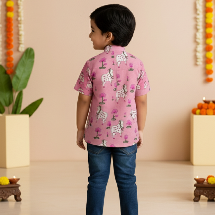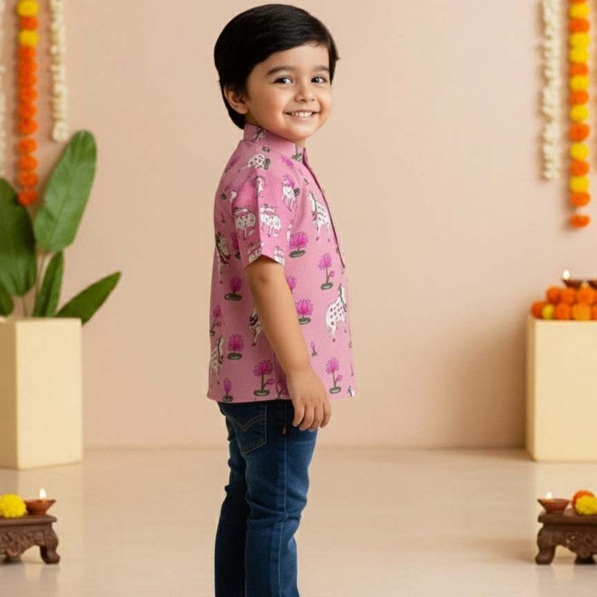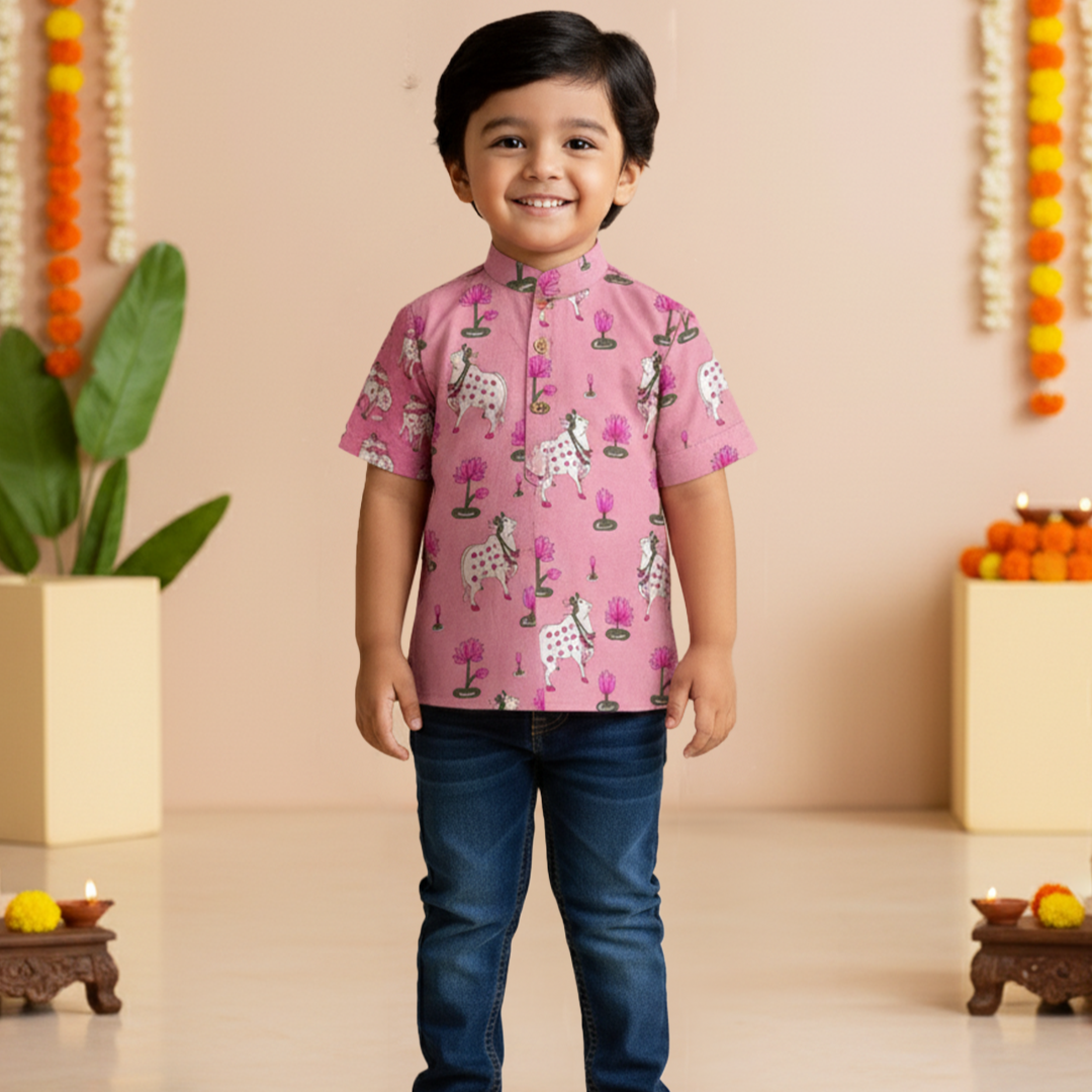 Pink Pichwai Kurta Shirt for Boys| Pure Cotton