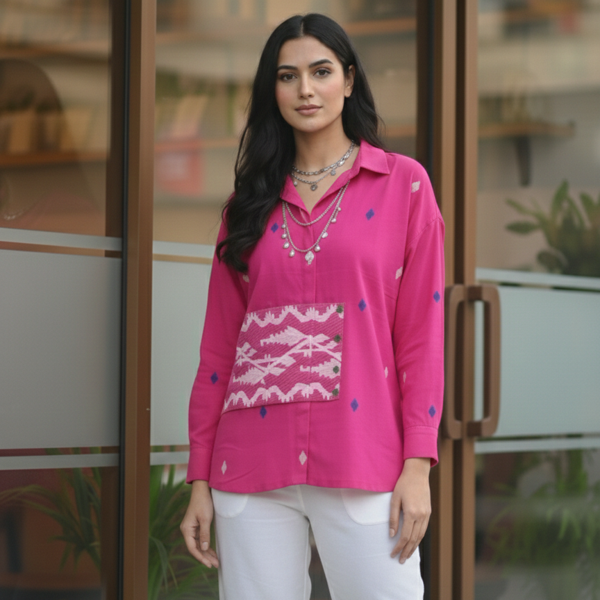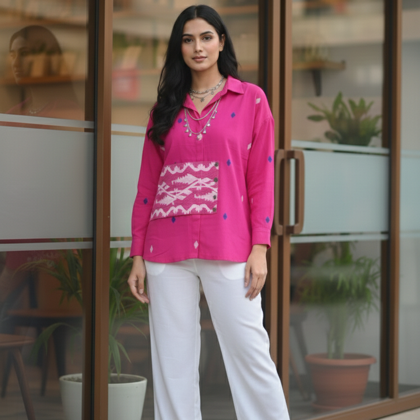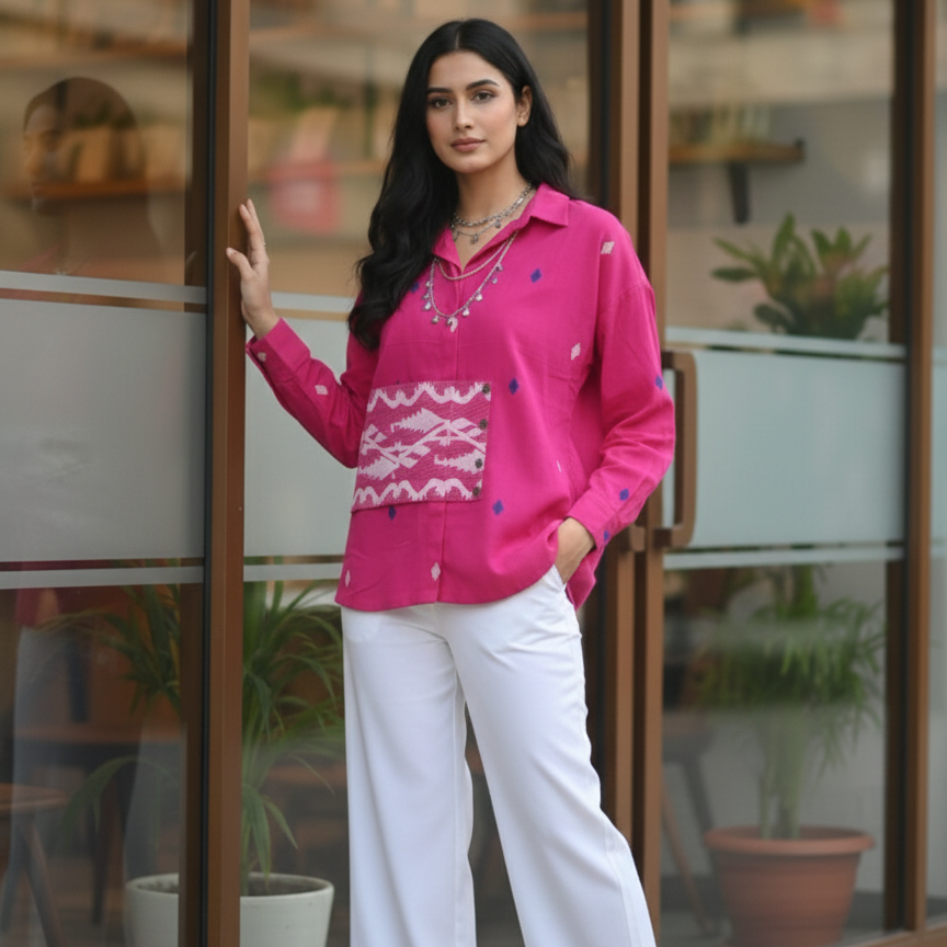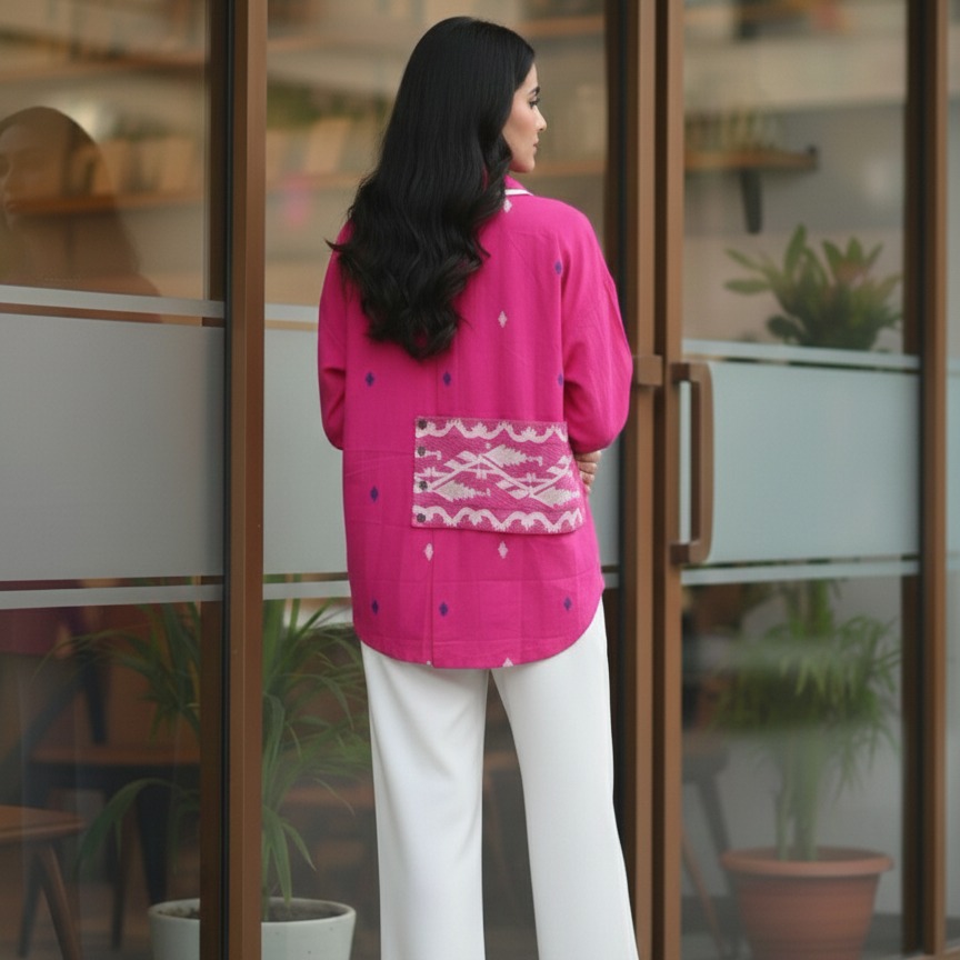 Crafted in handwoven Jamdani cotton, this Pink shirt features a contemporary anti-fit silhouette. The shirt is finished with flared sleeves and a bold Jamdani border at the hemline, adding depth and character to the overall form.