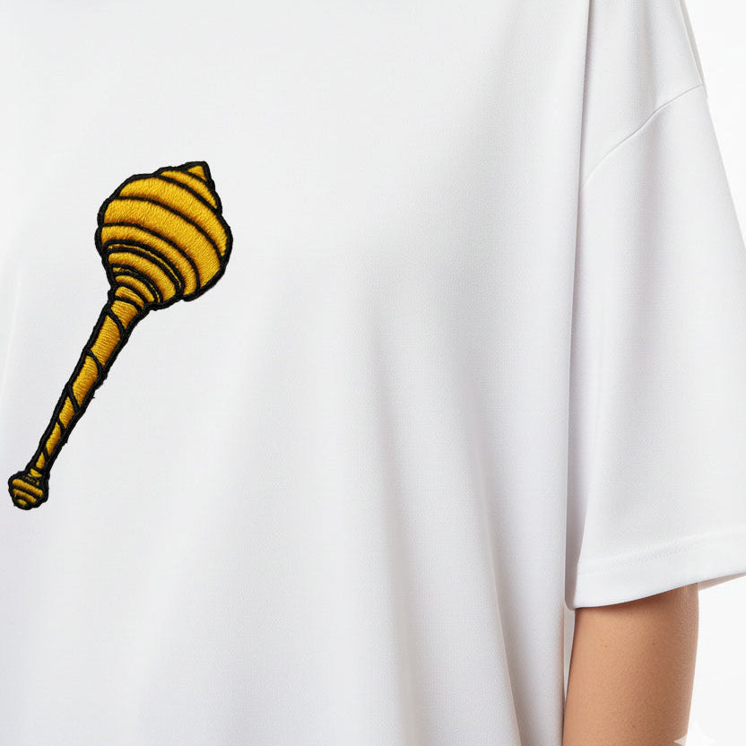 A subtle embroidered emblem placed close to the heart — as a reminder that divine strength always stays within.