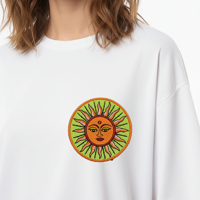 Featuring a minimal embroidered Sun motif on the front, symbolising energy, protection and auspicious beginnings.