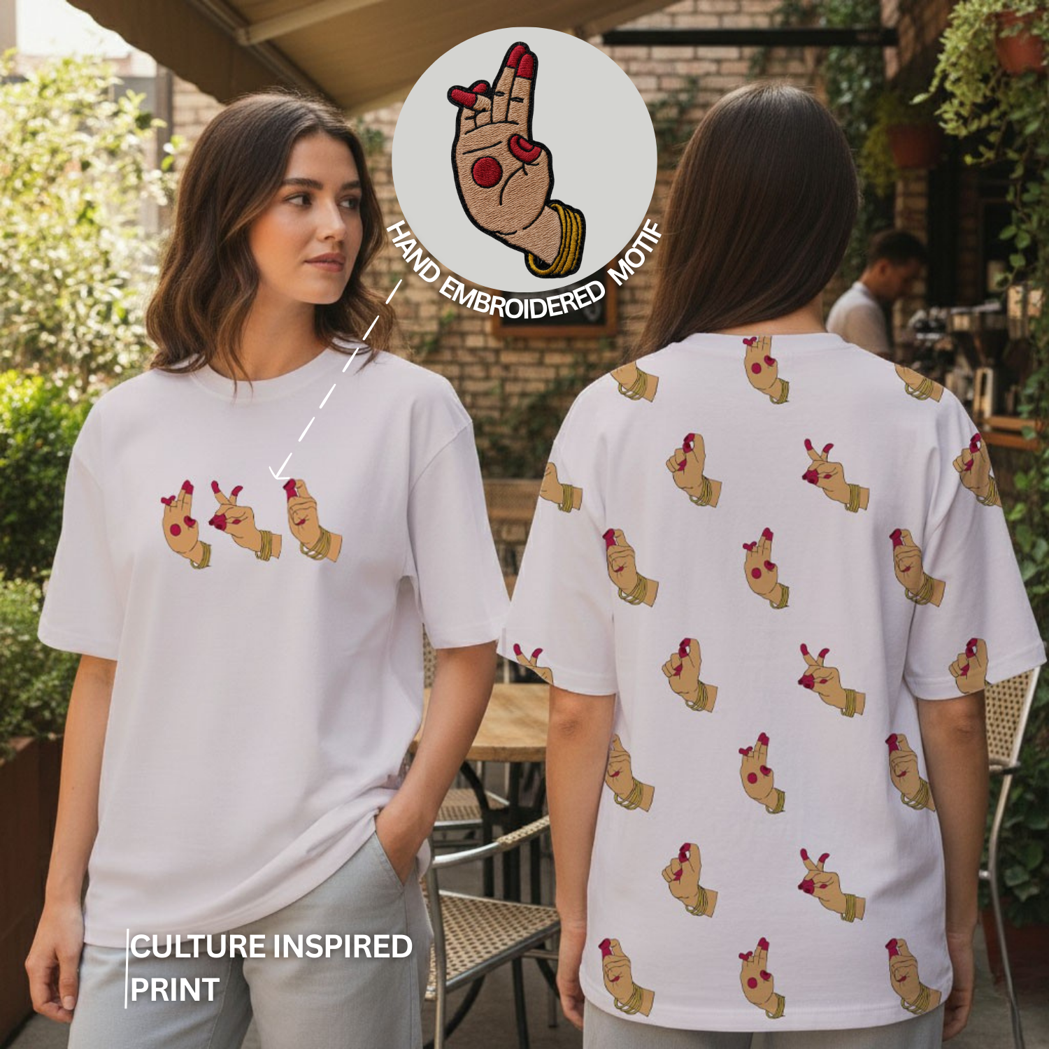 Featuring a minimal embroidered Mudra motif on the front — a quiet symbol of grace and cultural depth, worn close to the heart.