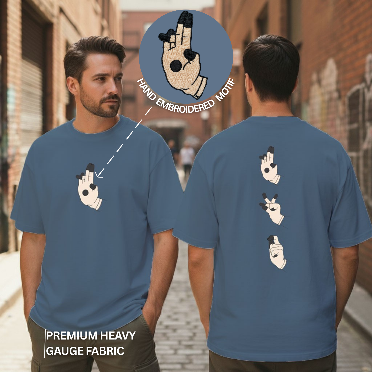 Featuring a minimal embroidered Mudra motif on the front — a quiet symbol of grace and cultural depth, worn close to the heart.
