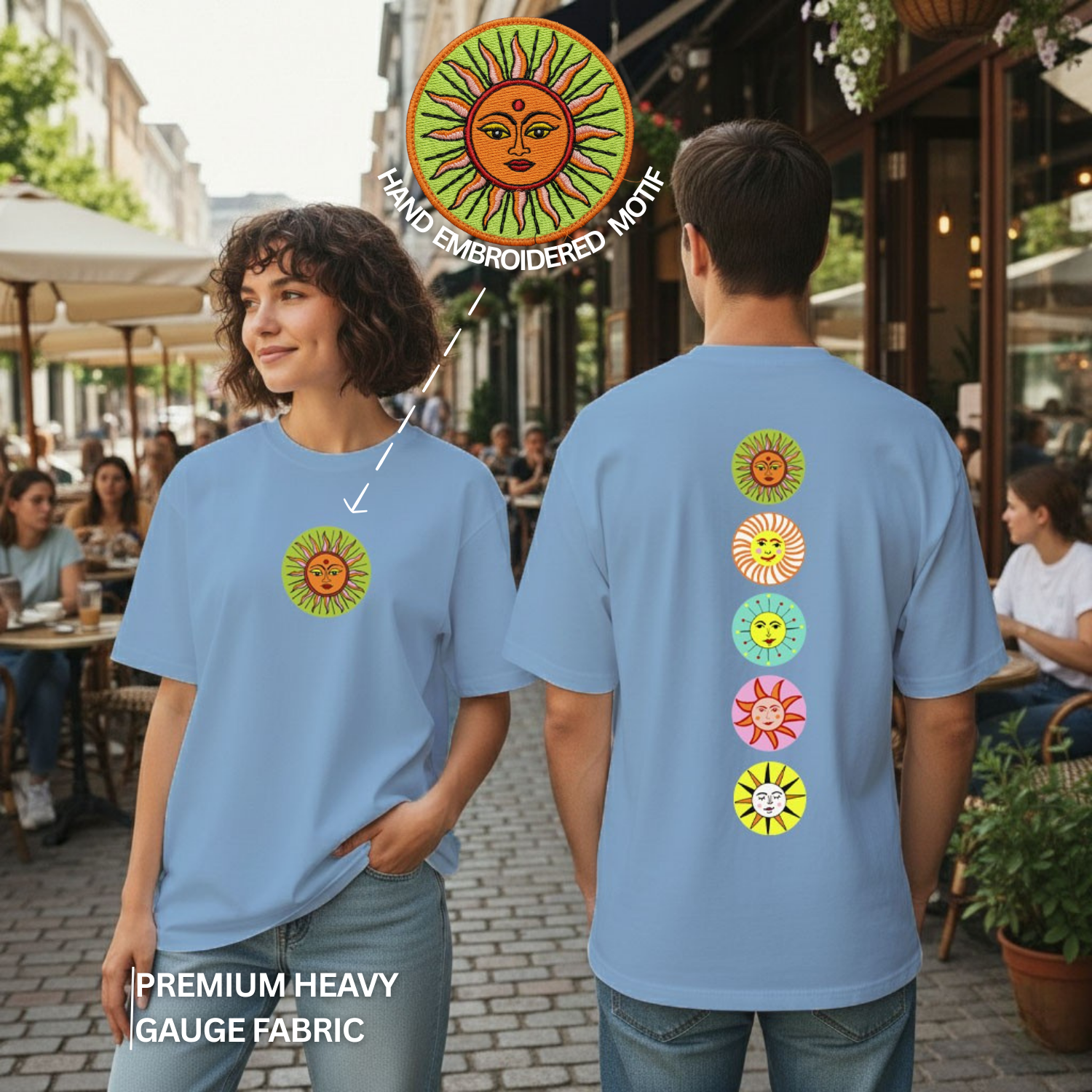 Featuring a minimal embroidered Sun motif on the front, symbolising energy, protection and auspicious beginnings.