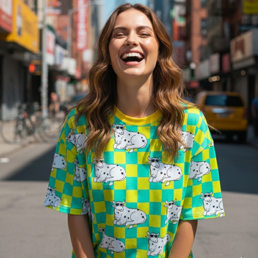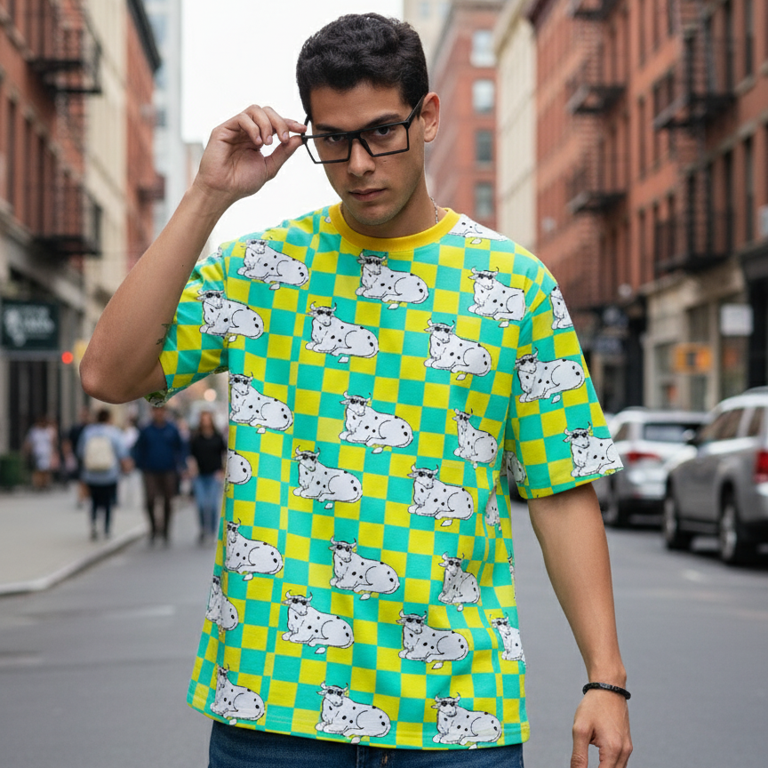 This isn't just a T.shirt, it's a statement piece. This over sized unisex tee combines iconic cow symbolism with bold contemporary design. The purple and yellow all-over checked print gives striking visual energy, while the cool seated cow with sunglasses adds a humorous and trendy vibe. It’s a perfect fusion of tradition and youth culture — turning everyday wear into a confident style statement.