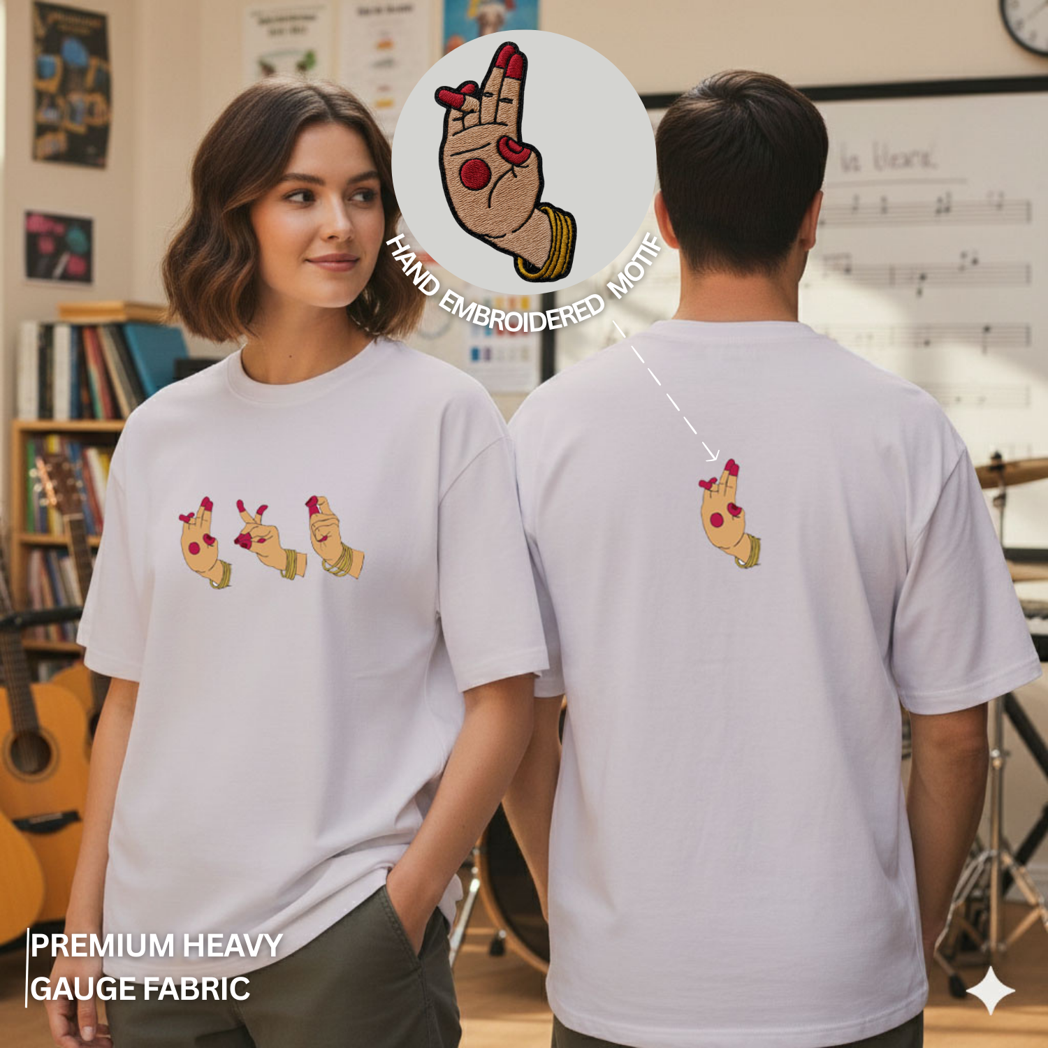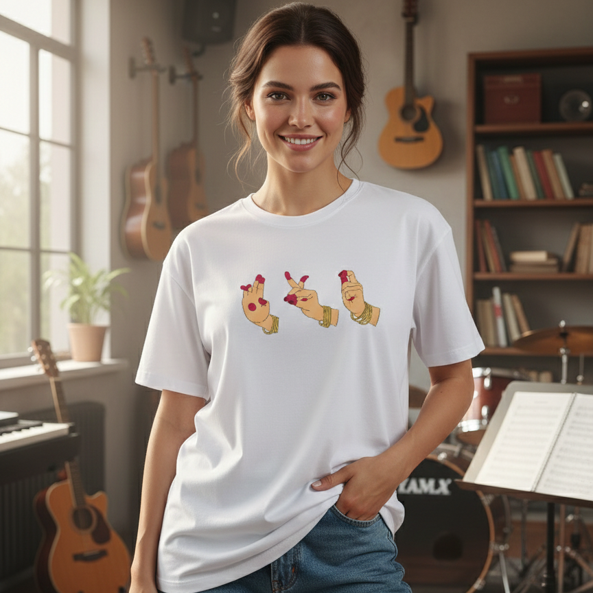 Featuring a minimal embroidered Mudra motif on the front — a quiet symbol of grace and cultural depth, worn close to the heart.