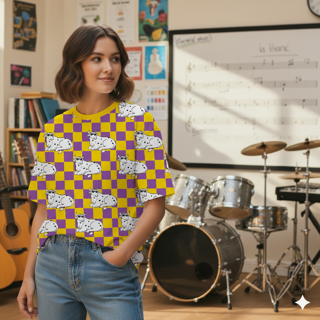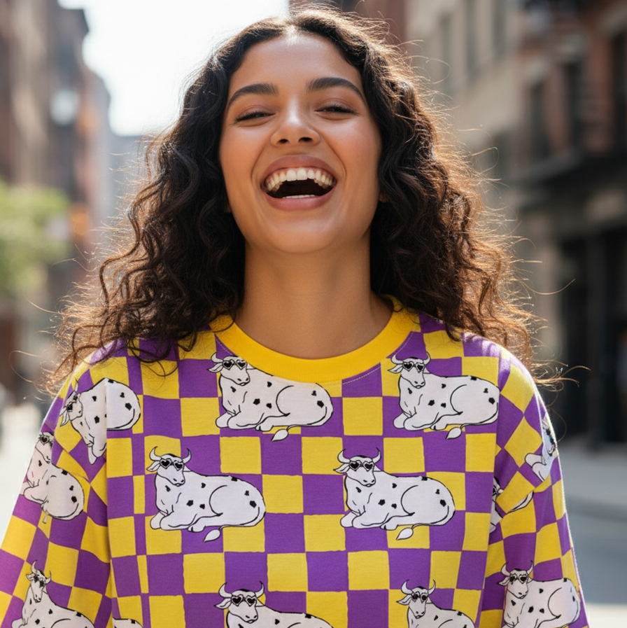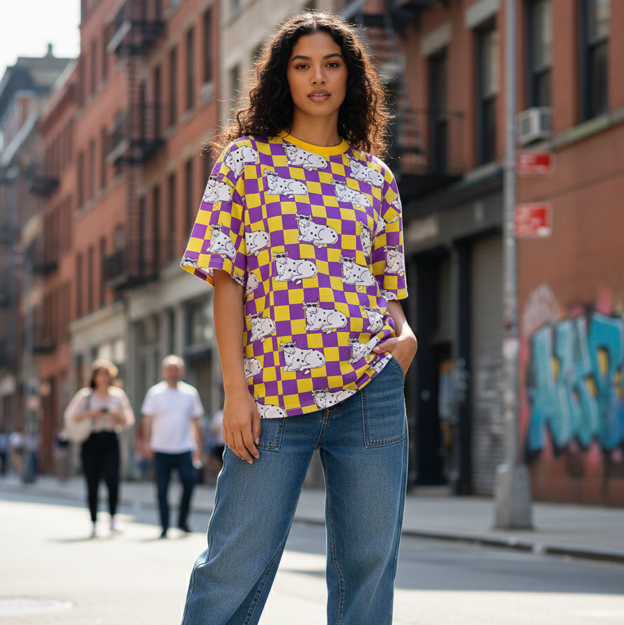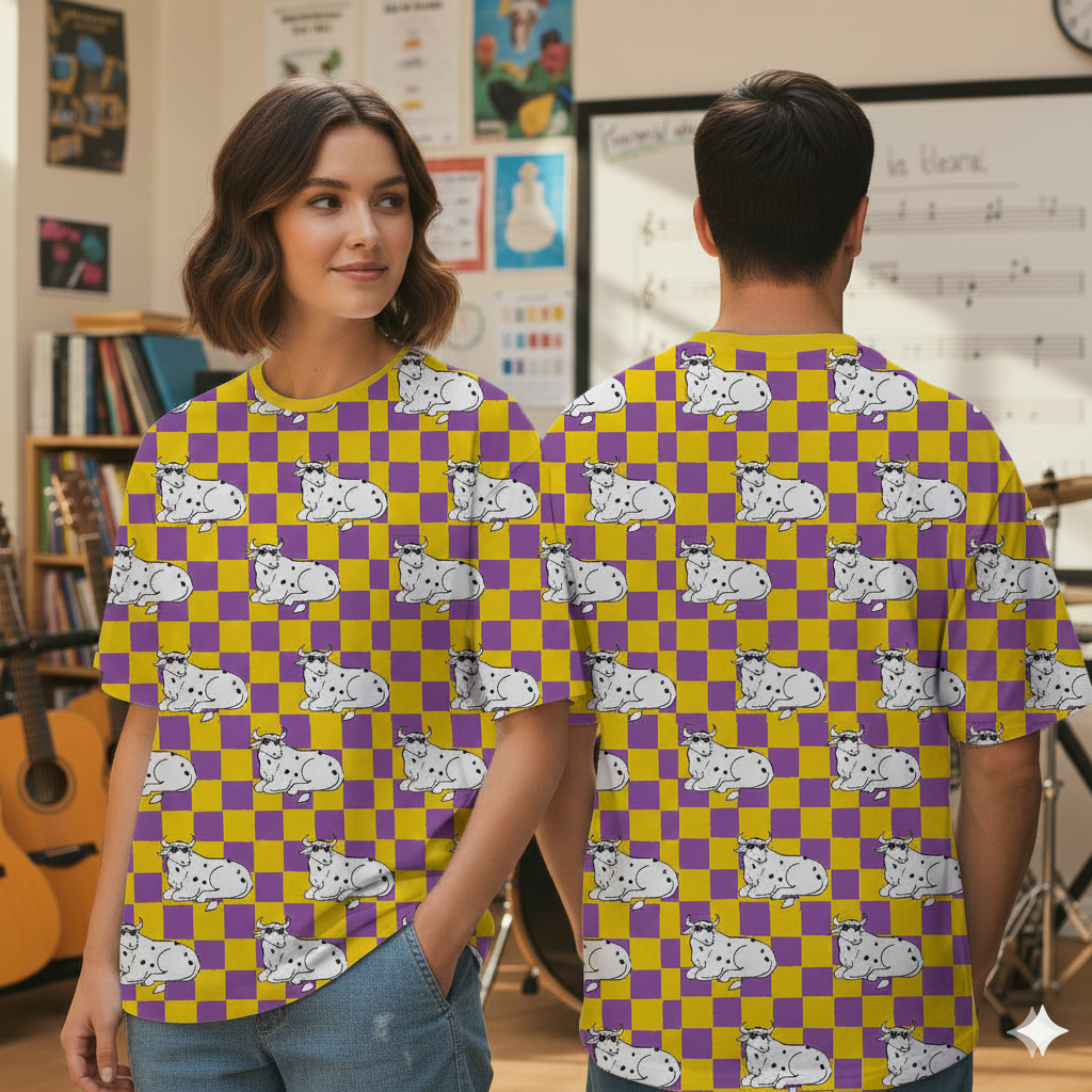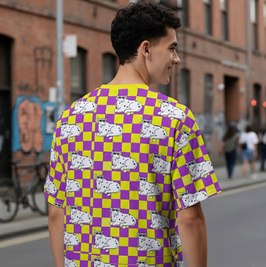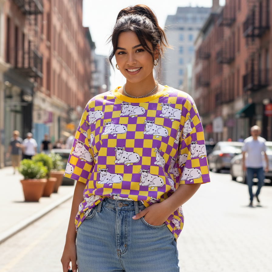 This isn't just a T.shirt, it's a statement piece. This over sized unisex tee combines iconic cow symbolism with bold contemporary design. The purple and yellow all-over checked print gives striking visual energy, while the cool seated cow with sunglasses adds a humorous and trendy vibe. It’s a perfect fusion of tradition and youth culture — turning everyday wear into a confident style statement.