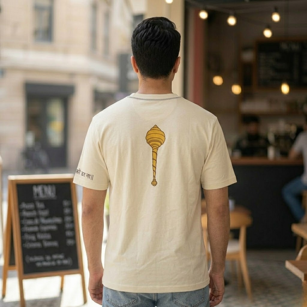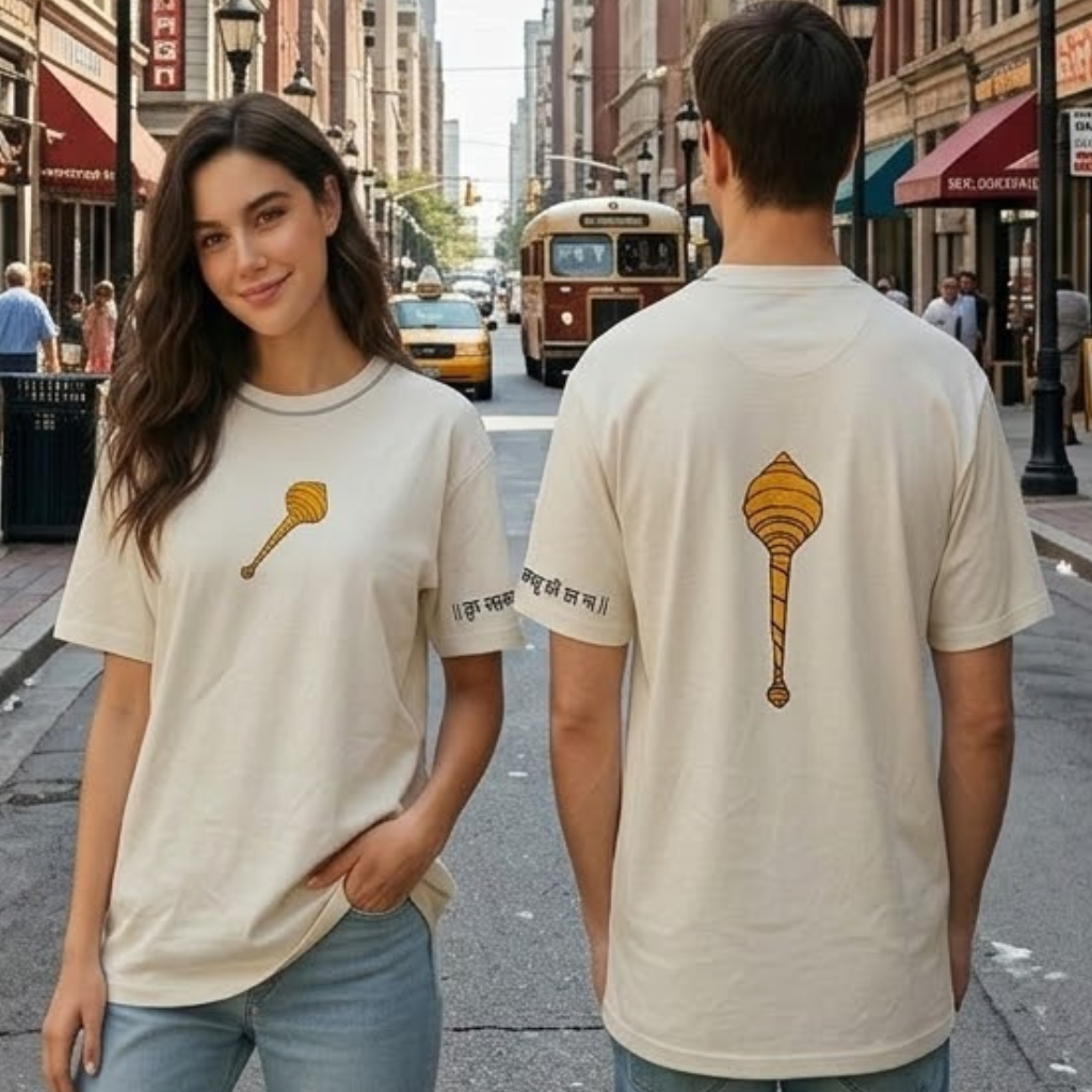 This oversized unisex t-shirt takes inspiration from the devotion and power of Lord Hanuman. The front features a finely embroidered Gada symbol, representing courage, protection, and inner strength. On the sleeve, a bold screen-printed artwork paired with the empowering line “When you are the protector, why fear?” reflects the fearless energy Hanuman embodies.