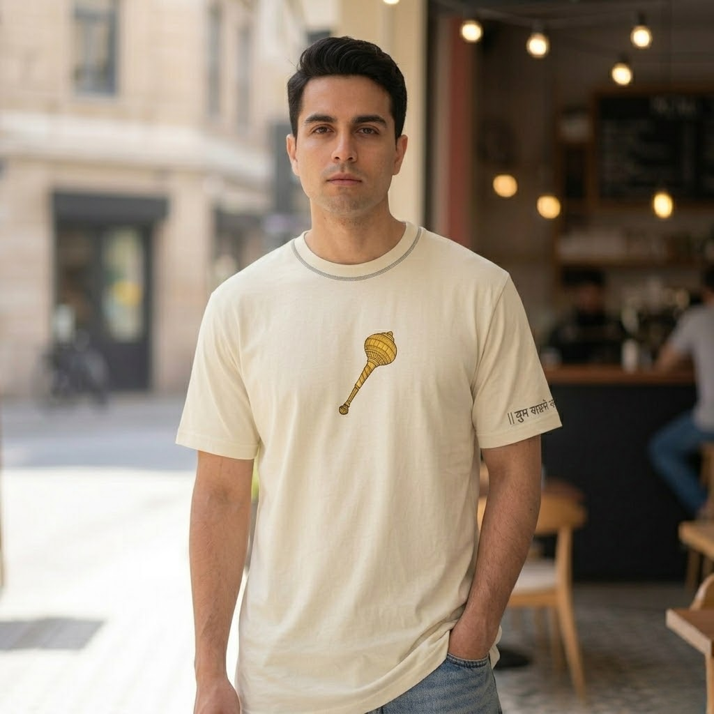 An embroidered Gada on the chest, reminding you to stay powerful and unshakeable.