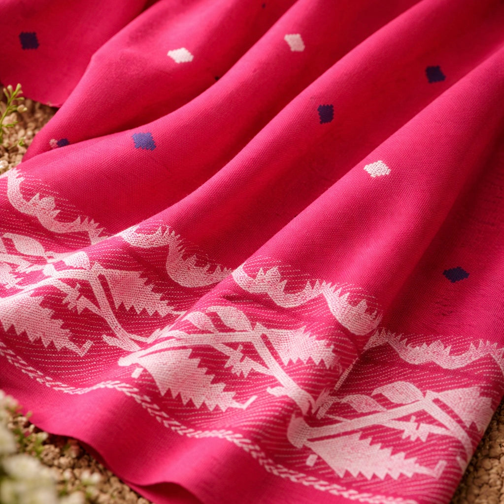 The fabric is procured from skilled weavers in West Bengal, known for their Jamdani weaving tradition.