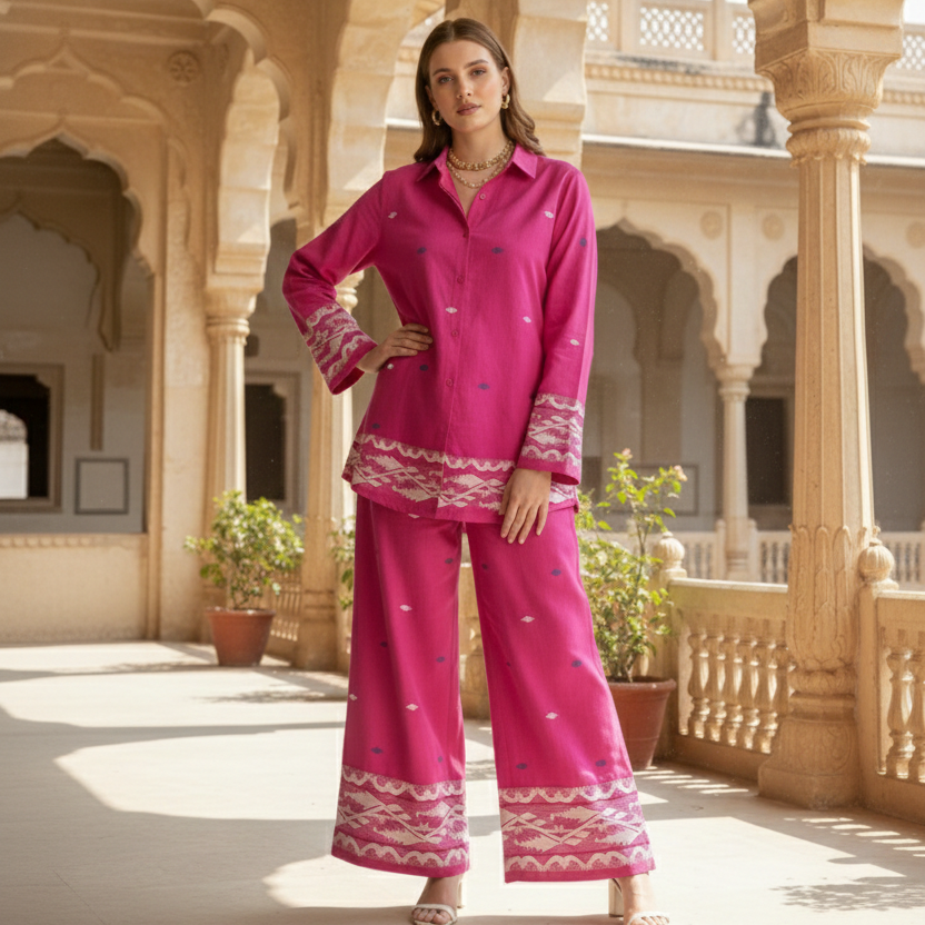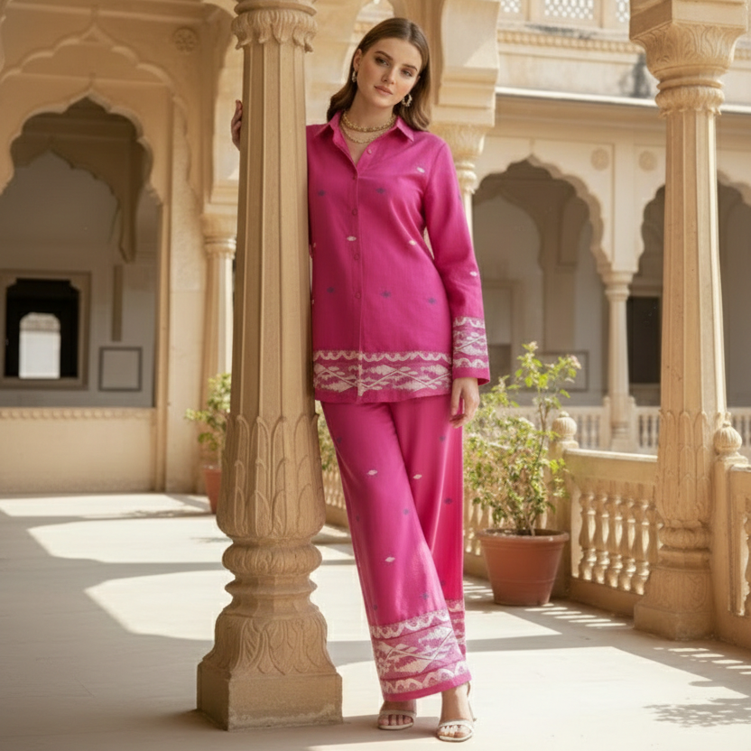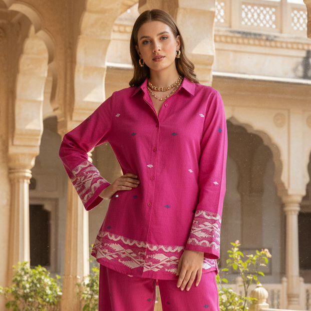A modern Co-ord crafted in handwoven Jamdani cotton, designed to sculpt gently without feeling restrictive. Light, breathable, and thoughtfully structured, this piece brings timeless craftsmanship into a bold, everyday silhouette.
