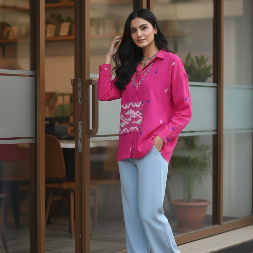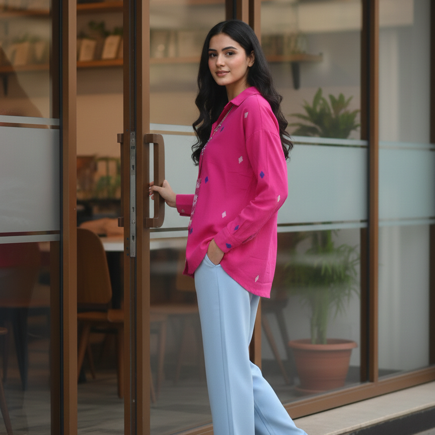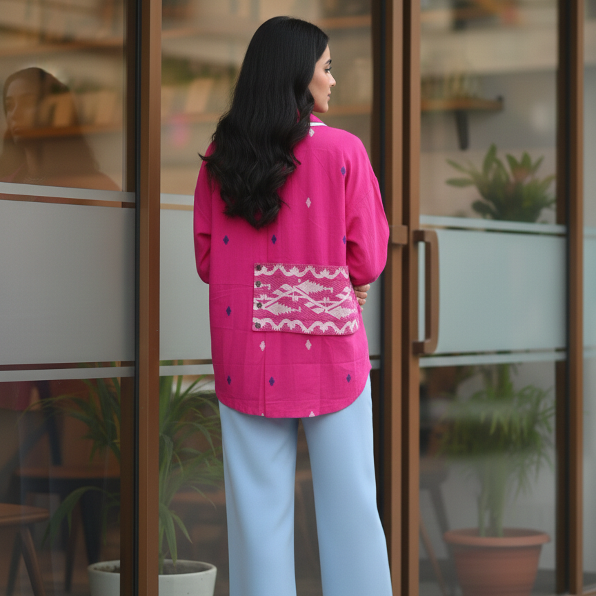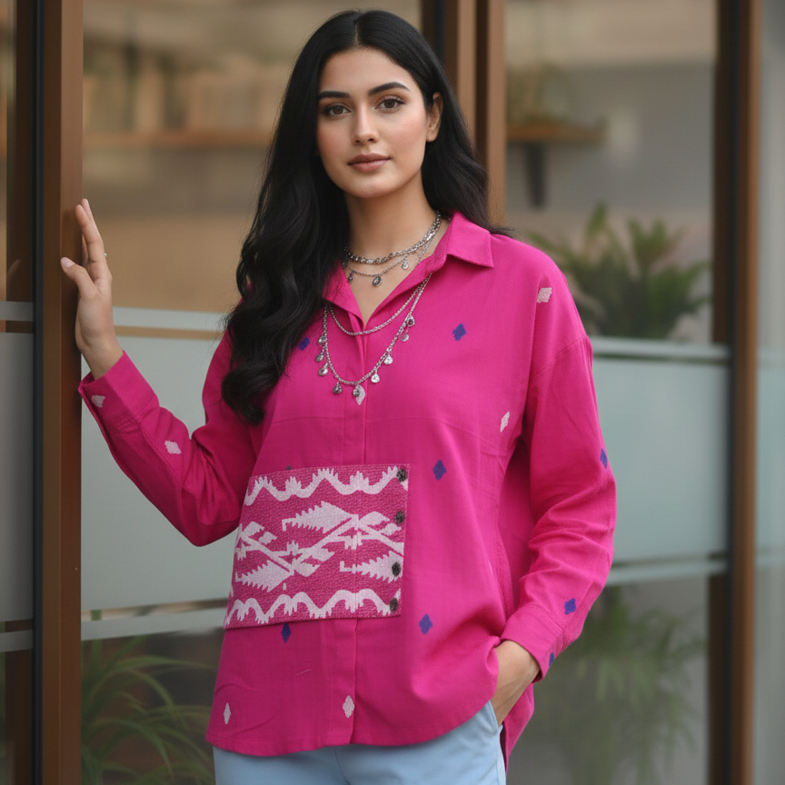 Crafted in handwoven Jamdani cotton, this Pink shirt features a contemporary anti-fit silhouette. The shirt is finished with flared sleeves and a bold Jamdani border at the hemline, adding depth and character to the overall form.