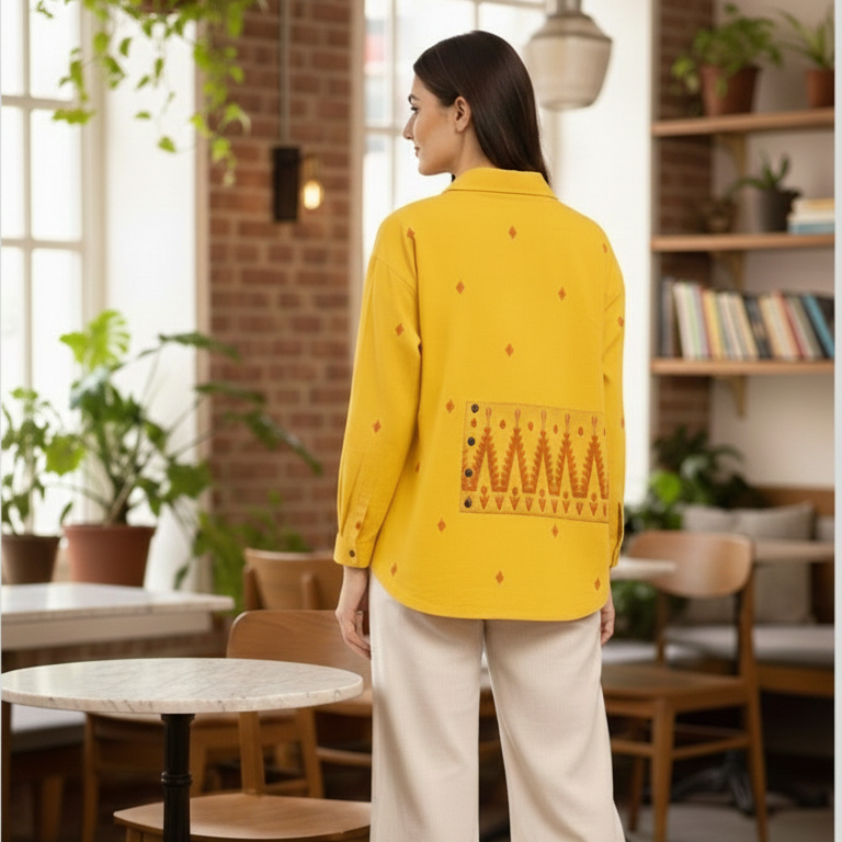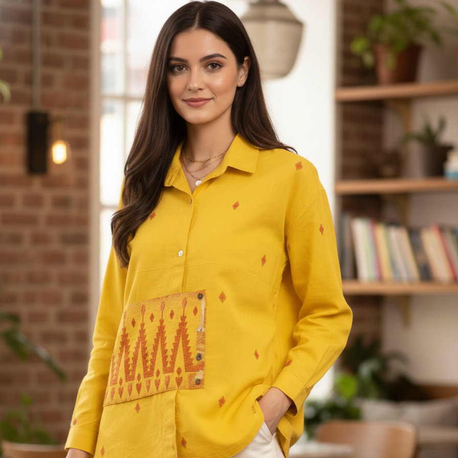 Crafted in handwoven Jamdani cotton, this yellow shirt features a contemporary anti-fit silhouette . The shirt is finished with flared sleeves and a bold Jamdani border at the hemline, adding depth and character to the overall form.
